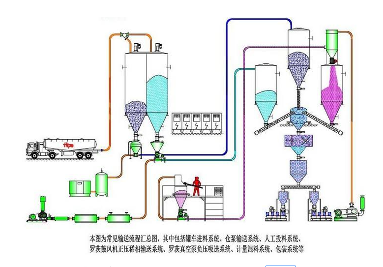 氣力輸送廣泛應用于石化、電力、化工、醫(yī)藥、冶金、建材等行業(yè)中粉粒狀物料的輸送。由于該輸送系統(tǒng)具有布置靈活,所占空間小,可避開已有設備和建筑物等優(yōu)點,因此特別適合于廠區(qū)的改造和擴建工程。目前,石化、化工行業(yè)大多采用了氣力輸送系統(tǒng)。錦工風機已為大大小小的上萬多條各種粉體輸送生產(chǎn)線配套了羅茨鼓風機, 錦工通過分析常用氣力輸送系統(tǒng)的性能特點和選型要求,指出了每種氣力輸送方法的差異和限制,并對氣力輸送的系統(tǒng)選擇、供料器選擇、羅茨鼓風機選擇、經(jīng)濟性分析對系統(tǒng)選型影響和設計要點進行了總結。