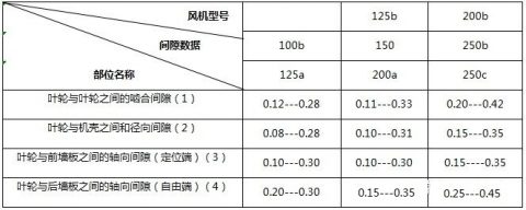 裝配間隙系20℃時(shí)的理論靜態(tài)間隙值。其能保證在額定工況下滿(mǎn)足動(dòng)態(tài)時(shí)所需之工作間隙。為此,裝配間隙乃是保證風(fēng)機(jī)性能和安全運(yùn)用的重要因素。每臺(tái)羅茨風(fēng)機(jī)出廠(chǎng)時(shí),皆已對(duì)裝配間隙進(jìn)行調(diào)整,用戶(hù)不得隨意變動(dòng)。具體間隙值見(jiàn)下表: