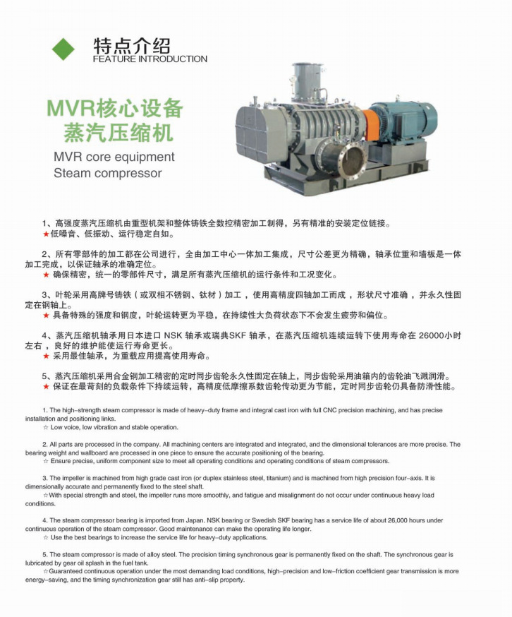 1、高強(qiáng)度蒸汽壓縮機(jī)有重型機(jī)架和整體鑄鐵全數(shù)控精密加工制得,另有精準(zhǔn)的安裝定位鏈接。