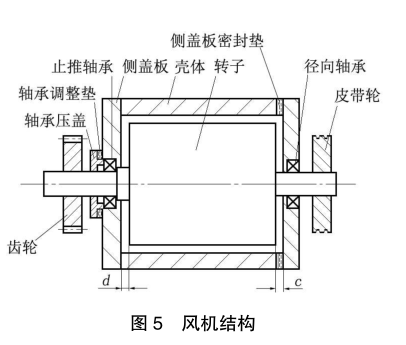 用塞尺法檢測轉(zhuǎn)子端面與機殼的軸向間隙。定位端( 齒輪側(cè))間隙d=0.1~0.2 mm,非定位端( 皮帶輪側(cè))間隙c=0.3~0.5 mm,總間隙的標(biāo)準(zhǔn)是 0.4~0.7mm。